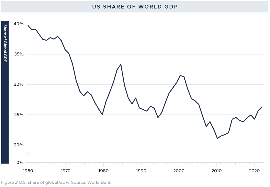 미국은 1960년대 전체 세계 GDP의 약 40%를 차지하였으나, 2012년에는 이 비율이 21%까지 감소하였고, 최근에는 26% 수준으로 소폭 회복하였습니다. 그러나 이는 여전히 위에서 언급한 “트리핀 임계점”에 도달하기에는 거리가 있는 수준입니다. 그 이유는 달러나 미국 국채(UST)를 대체할 수 있는 실질적인 대안이 존재하지 않기 때문입니다.