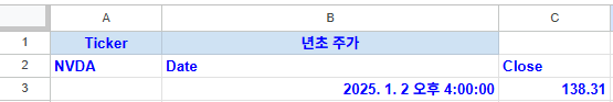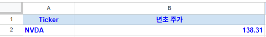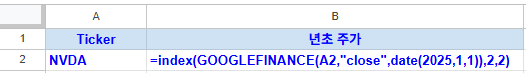 우선 아래와 같이 엔비디아의 Ticker 'NVDA'를 A2에 입력하고, B2에 GOOGLEFINANCE 함수를 사용하여 A2의 Ticker를 읽어와서 'close' 속성을 입력한 뒤, date함수로 년초를 입력합니다. 이때, 입력 양식은 DATE(2025,01,01)과 같습니다.
