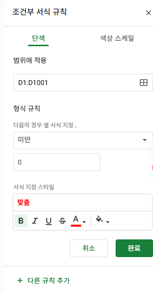 조건부 서식을 클릭하여, 아래와 같이 서식을 정하고 싶은 열을 선택(본 글에서는 상승/하락률 데이터가 있는 D열을 선택)하여 서식을 지정합니다. 여러 가지 서식을 지정하고 싶은 경우에는 아래의 '+ 다른 규칙 추가'를 선택하여 중복으로 서식을 지정할 수 있습니다.